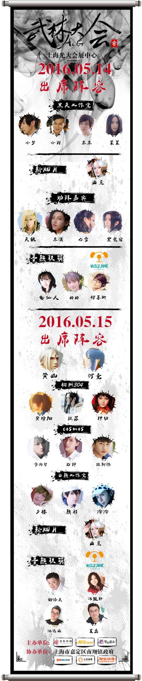 2016年5月14-15日!ACG武林大会登陆魔都!各大武侠门派、武林豪杰共聚魔都!国内顶尖ACG品牌强强携手,各路嘉宾齐登台,秦时明月、剑网3、古剑奇谭、仙剑奇侠传 、画江湖之不良人、轩辕剑 、天下3、蜀山战纪手游、太乙仙魔录、天行九歌、武庚纪 ,携惊天秘宝,会天下群雄。