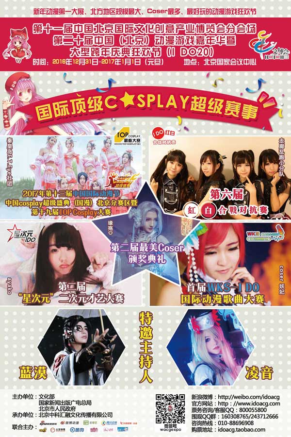 IDO娘喊你来IDO看最顶级的大赛啦~2017年第十三届中国国际动漫节中国cosplay超级盛典(国漫)北京分赛区暨第十九届TOP Cosplay大赛;第二届“星次元”──二次元才艺大赛;首届WKS-I DO国际动漫歌曲大赛;第六届红白合战对抗赛!百余团队!2000余名COSER!青春热血,等你来战!!!