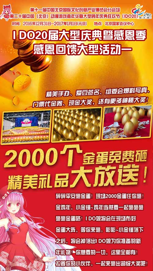 碎碎平安砸金蛋!现场2000金蛋任你砸!金鸡年,小金锤~鸡年当然要一起砸砸砸砸砸金蛋咯!IDO娘将会在现场布好金蛋大阵,等你来砸。内含IDO娘为你准备的新年礼物哟~精美手办、爱豆签名、组委会爆料写真、门票代金券、现金大奖,还有超多神秘大奖,你想要的一切,这里全都有!拉着你的小伙伴,一起来砸出超级大奖吧!