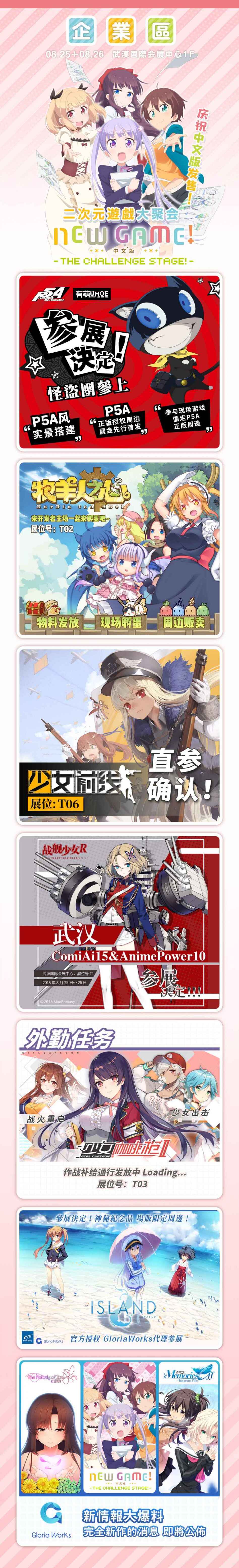 台上LIVE火热朝天,台下展商活动也是络绎不绝!本届CA15二次元企业区有:热门动画《女神异闻录5》参展,官方授权周边贩卖,P5A风实景搭建,锁定T4展位的勒布朗咖啡店;《牧羊人之心》开发组齐上阵,来T2展位探讨最科学的孵蛋玄学时间;亲爱的指挥官们~《少女前线》来了,请指挥官请聚焦T6展位;《战舰少女R》向您报道,指挥官让我们相遇在T1展位吧;《少女咖啡枪2》在T3展位执行外勤任务,请来参观吧;Frontwing携Island和“GRISAIA”系列出展,更有神秘纪念品和场贩限定周边,更多内容敬请关注T5展位;Gloria Works新情报大爆料,更多完全新作消息密切关注后续CA组委会报道!