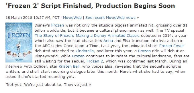 《冰雪奇缘2》正由导演克里斯·巴克和珍妮弗·李率领原作团队倾情打造,词曲作者与主要配音演员也尽数回归。她认为第二部的故事很棒,质量很好。她说创作团队花了很多心思来考虑要在续集中讲什么,所以才会用这么久的时间。虽然官方还没有公开《冰雪奇缘2》的配音名单,但是感觉应该还是之前的阵容。