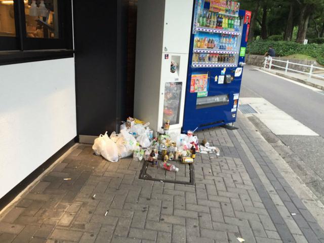 自动贩售机周围是垃圾重灾区,白天看也触目惊心。