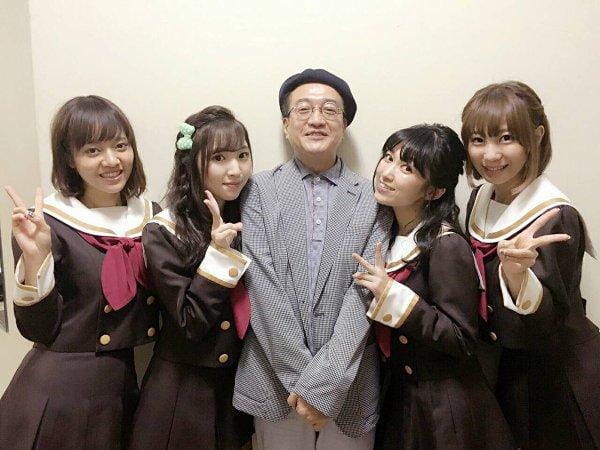 从图片上可以看到,四名主要角色的声优穿着作品里面角色的校服,跟站在中间的导演一起合影。而这其中,有两名美女声优的前胸贴在了导演的身上,看起来是非常开心的样子。相比起来,石原立也导演则显得有些拘谨,似乎是不太习惯于被美女们包围的感觉。