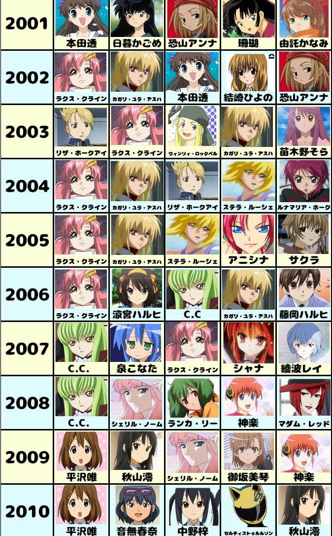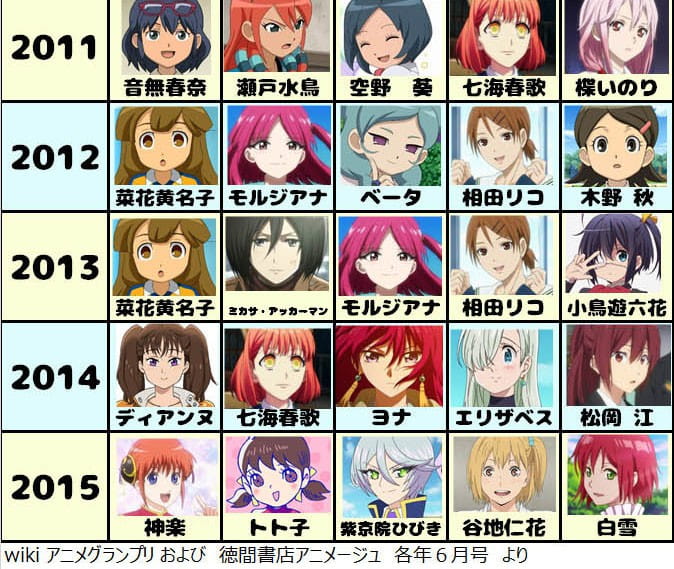 这份是德间书店出版的动漫杂志《Animage》的人气女性角色变迁表,该表列出的是1983年至2015年间《Animage》6月号中的女性角色人气投票排名前5名。我们可以看到其中早期的时候经常都是一个角色能在排行榜上停留很久,而且有些角色现在看依然是女神啊。