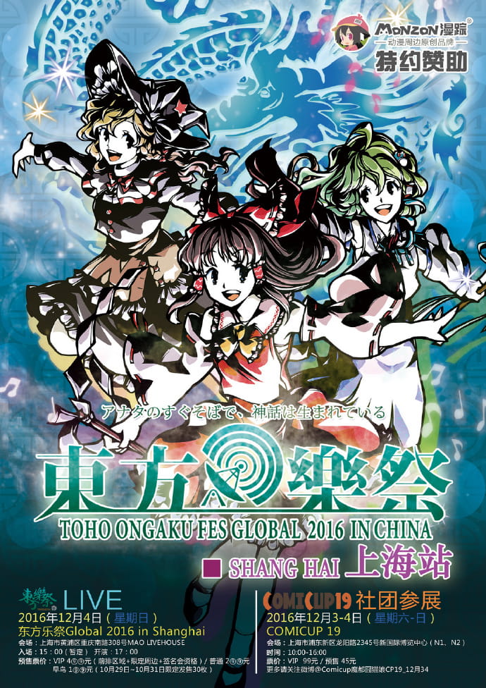 在本年度中,东方乐祭在经历北京、成都、广州的三地的盛宴后,将在魔都上海举行本年度最后一场Live活动!乡民们展现的近乎狂热的热情使我们深深的被打动。对于东方系列作品的热爱使得同好们跨越语言,跨越地域,跨越文化一同汇集到一起展现爱与信仰。我们在 12月4日上海MAO Livehouse “东方乐祭Global 2016 in China”【上海站】等待你的到来!