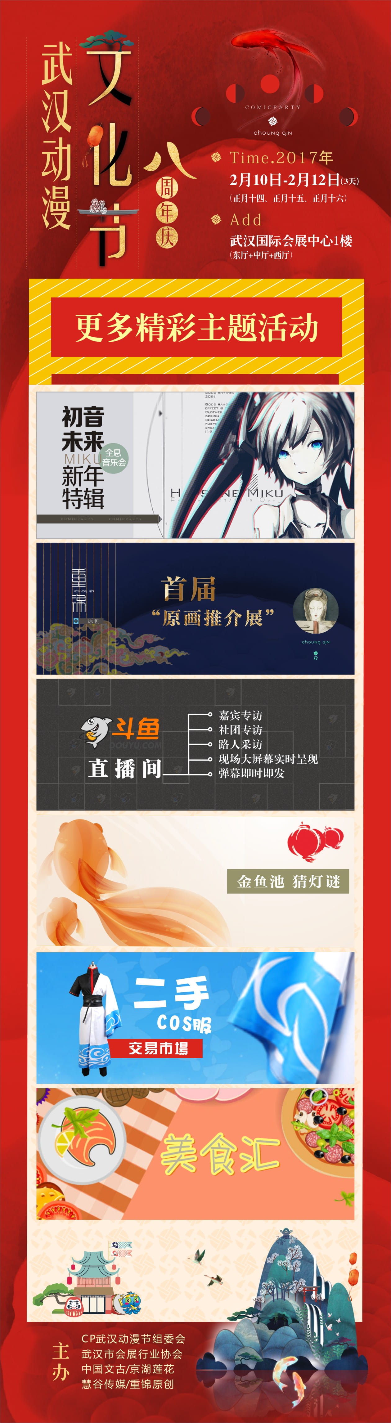 还有更多精彩主题活动:重锦原创“原画交流展”、全息音乐会·初音未来新年特辑、金鱼池、猜灯谜、二手COS服交易市场、美食汇、斗鱼直播间等,总之就是活动多多、精彩多多,一天下来都逛不完啊!