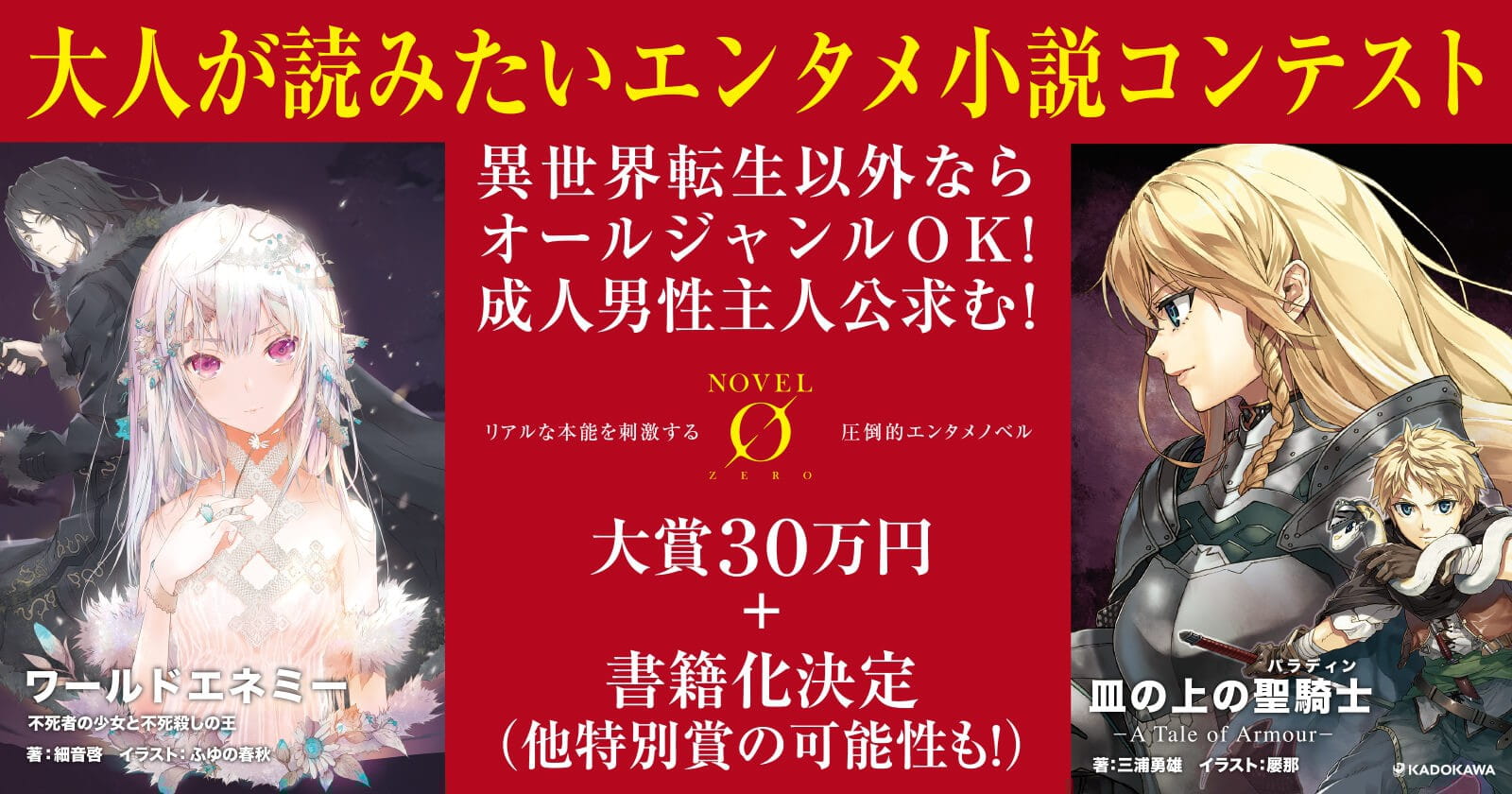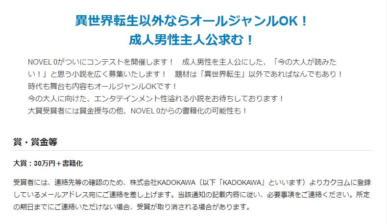 根据介绍,本次大赛的主办方为角川旗下的新文库“NOVEL 0”,主题是选拔出“大人们想看的小说”。在宣传图的显著位置上,官方用明确的字样标注出“除了异世界转生以外的任何体裁全部OK”,并要求主人公要是“成年的男性”,目的是让特定年龄阶段的读者产生代入感。