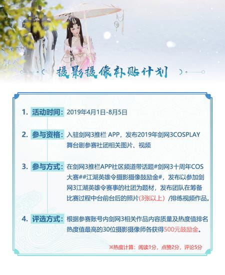 参赛的侠士们须入驻剑网3推栏APP,于2019.4.1-2019.8.5期间,在剑网3推栏APP社区频道带话题#剑网3十周年COS大赛##江湖英雄令摄影摄像鼓励金#发布2019年剑网3Cosplay舞台剧参赛社团相关图片、视频(3条以上),剑网3相关作品内容质量及热度值排名最高的30位摄影摄像师各获得500元鼓励金。