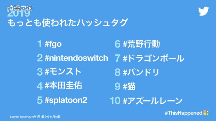 日本推特公开了在2019年常用的话题和标签的榜单。在综合榜单中,日本最常用的标签是“fgo”,任天堂的游戏机NS排名第二,游戏怪物弹珠排名第三。后面依次是:足球运动员本田圭佑,喷射战士2,荒野行动,龙珠,BanG Dream!,猫,碧蓝航线。