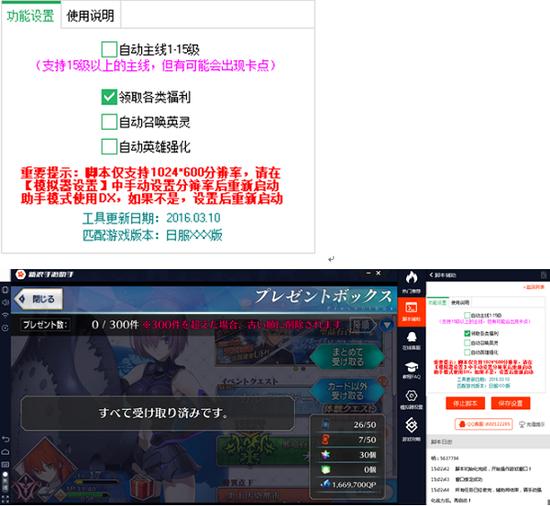 1、自动主线:进入游戏后,保存设置启动工具,脚本会自动进行主线,选角色之前的部分需要手动操作。