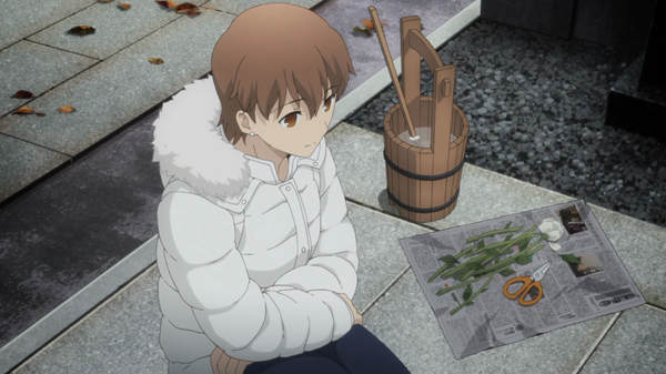ubw 12话中,来扫墓的大河。注意水桶、剪刀和花朵这些细节。而此时士郎却在和妹子约会。。(´Д`) 我突然明白她不是一个神经大条的女汉子。