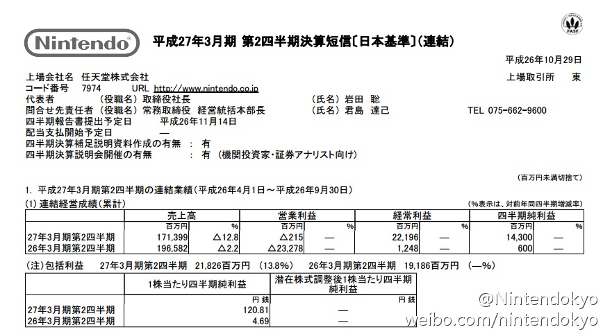 任天堂Q2财报:相比去年同期营业赤字大幅缩小至2亿日元,并且依靠汇率收益最终实现了143亿日元的纯利润盈利!(不过营业额并未有多大提升,3DS和WiiU的硬件销量比起同期也下滑较大)『任天堂大乱斗』世界销量322万,海外版『朋友聚会』127万,马车8和塞尔达无双也分别作出部分贡献。任天堂继续加油啊